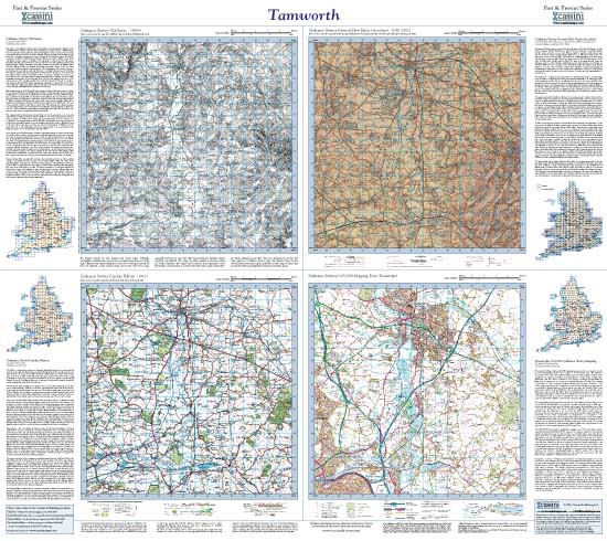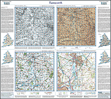 | Easy comparison of past and present. 4 periods, 4 maps, 1 scale.Ordnance survey One-Inch maps from the Old series, New Revised Series and Popular Edition enlarged, re-projected and shown alongside present day 1:50,000 mapping. |