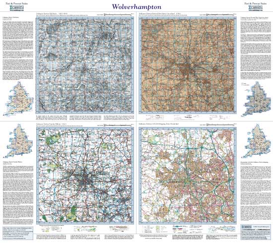 | Easy comparison of past and present. 4 periods, 4 maps, 1 scale.Ordnance survey One-Inch maps from the Old series, New Revised Series and Popular Edition enlarged, re-projected and shown alongside present day 1:50,000 mapping. |